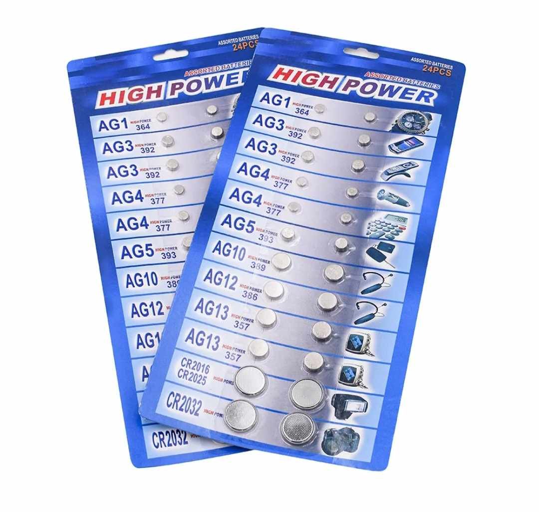 2 x AG , 4 x AG, 4 x AG4, 2 x AG5, 2 x AG10, 2 x AG 12, 4 x AG13, 1 x CR2016, 1 x CR2025, 2 x CR2032